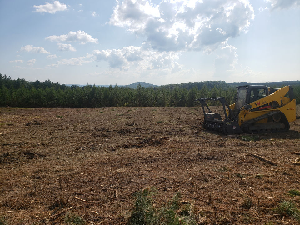 Forestry mulching is a land-clearing method that selectively removes trees, brush, and vines to clear unwanted vegetation while leaving behind a fine layer of mulch that is operational as well as beautiful. Forestry mulching is more efficient than using a chainsaw or a tractor with a bush hog while more cost-effective than using multiple larger machines and burning. This one-machine method can take all stumps and stems flush to the ground, leaving a surface that can be immediately driven over, mowed, or seeded.